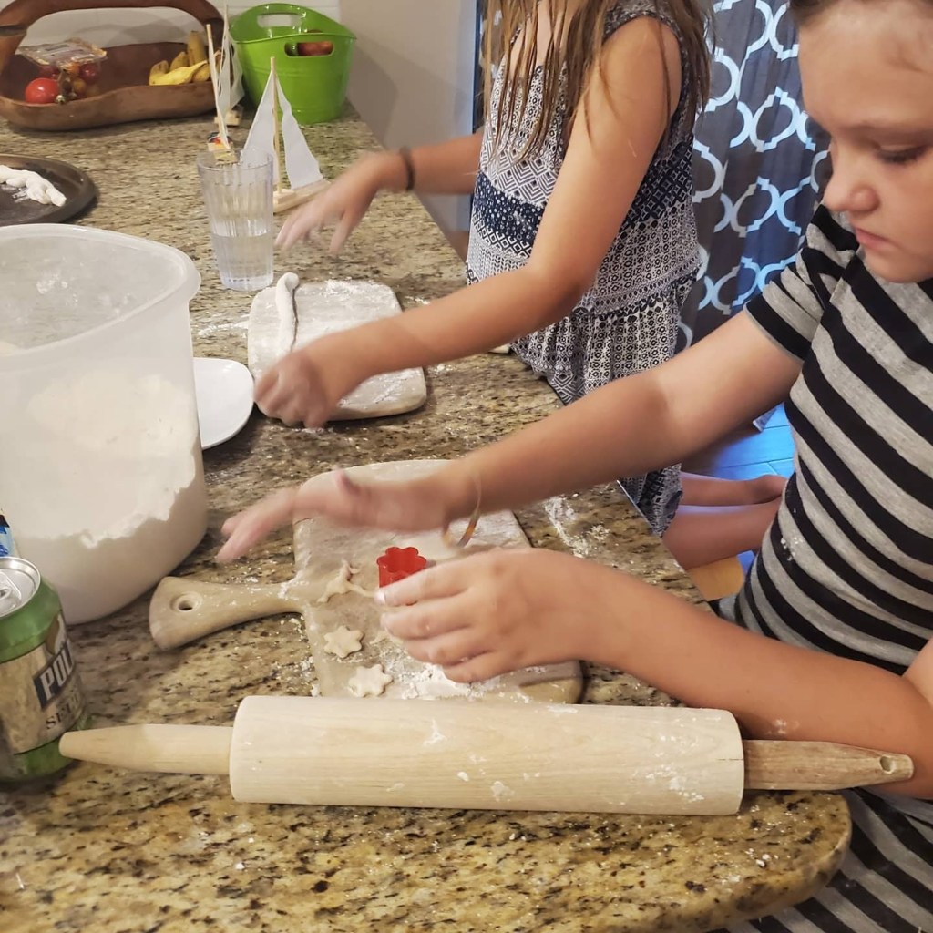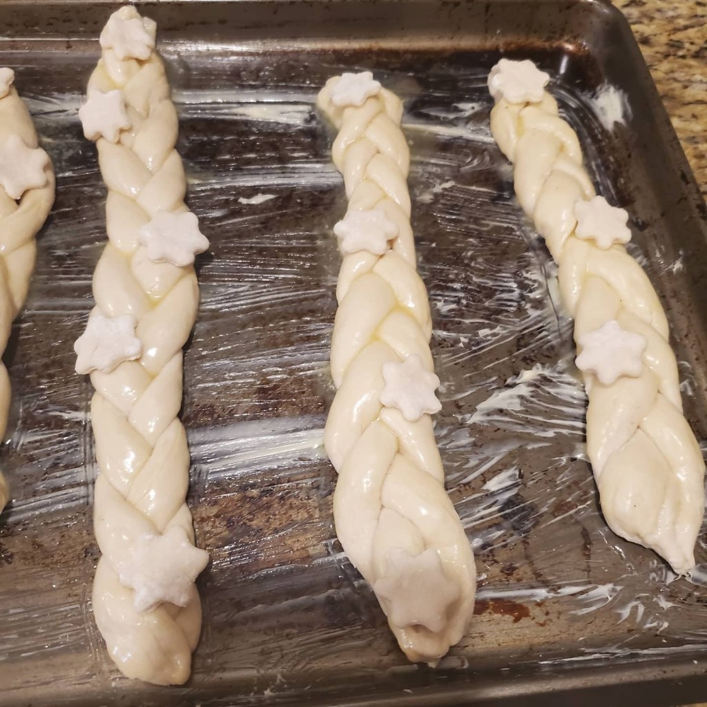 For our Rapunzel day, we wanted the breadsticks to look like Rapunzel’s hair after the little girls braid it. So the girls cut out flowers from the dough and added them to the braided breadsticks.