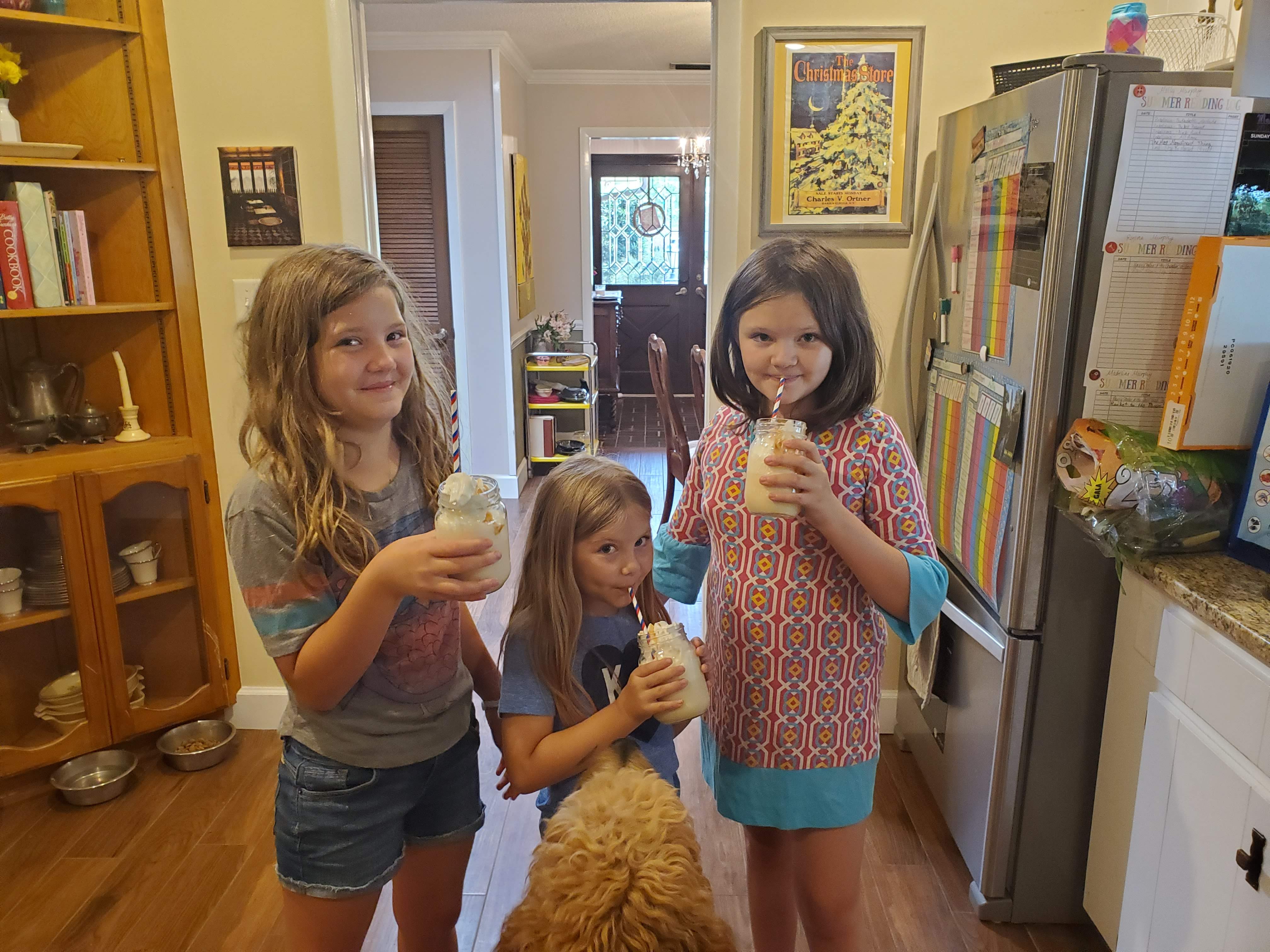 We used a super simple recipe to make butterbeer milkshakes – vanilla ice cream, butterscotch syrup, and cream soda. Then we topped with whipped cream and drizzled some butterscotch. The girls loved it, but now that they are Wizarding World pros, they say it doesn’t taste like the real thing.