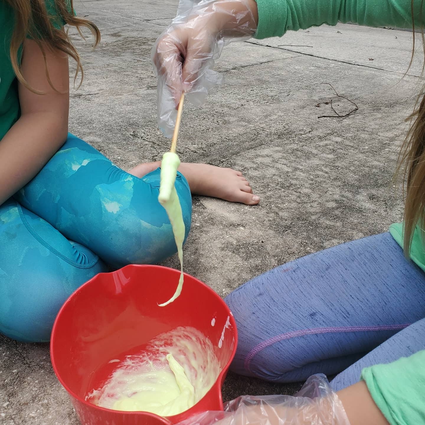The girls love slime. I think it is weird and gross, and daddy is totally opposed to it. But, Shrek ear wax slime fit our theme, so out to the driveway we went. We used Elmer’s Butter Slime Kit and it turned out pretty much just as we had hoped it would.
